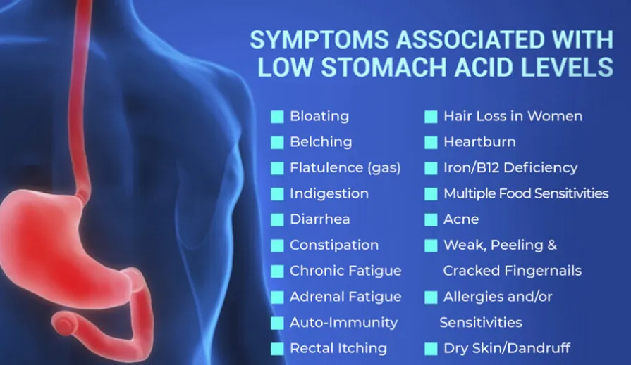 When your body doesn’t produce enough hydrochloric acid (HCL), food sits in your stomach longer, allowing bacteria to metabolize and produce uncomfortable symptoms such as gas, belching, acid reflux, bloating, cramping, chronic bad breath, undigested food in stools, aversion to meat, tiredness after meals, feeling full but still hungry, chronic anemia, weak fingernails, and frequent nausea.